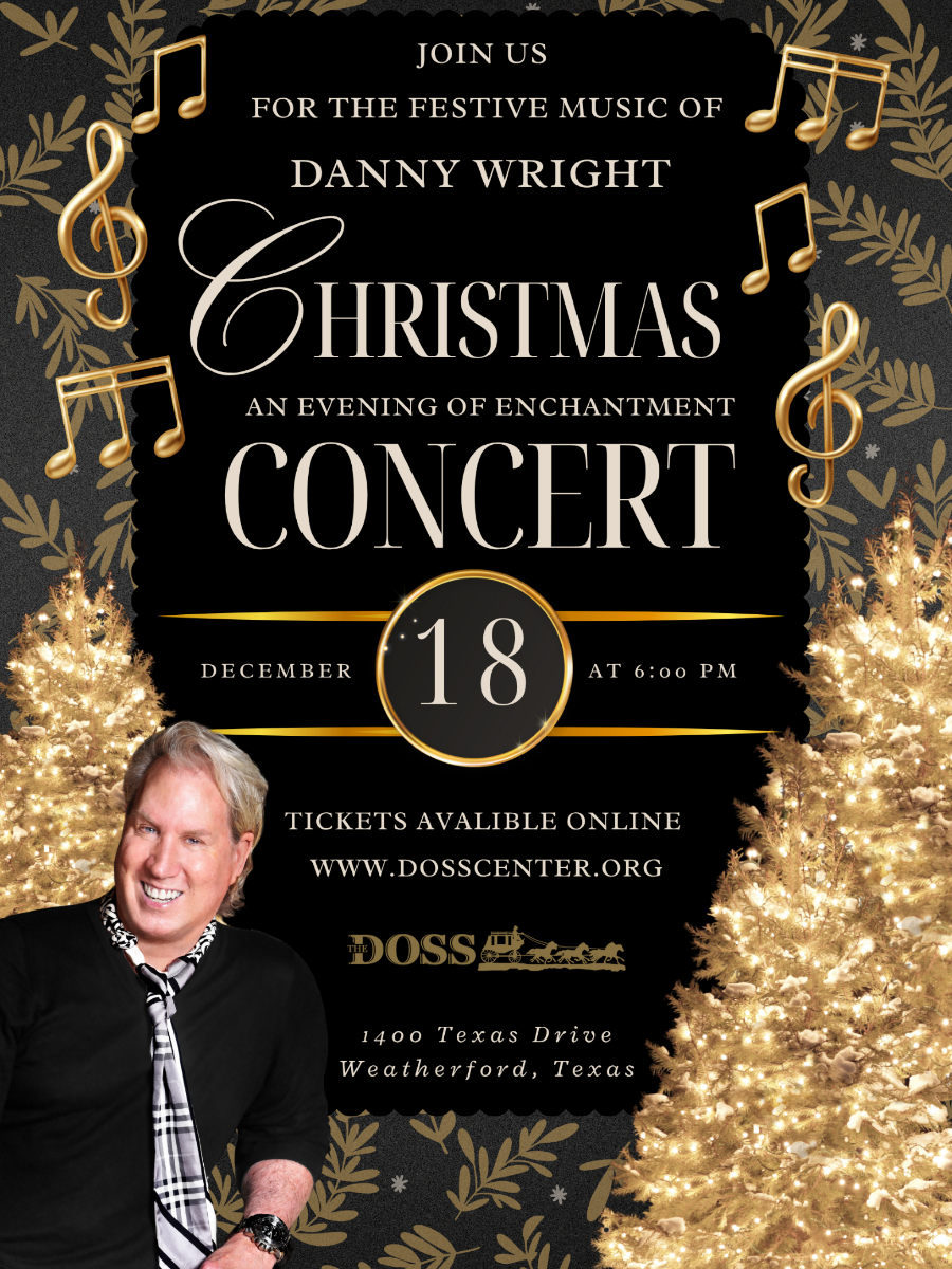 Come enjoy the festive music of American concert pianist Danny Wright at the Doss Heritage and Culture Center in Weatherford, TX. Danny will be playing a selection of his favorite songs from his ten Christmas albums that is sure to delight music lovers of every age. Danny has been named twice by Billboard magazine as a Top 10 artist in the New- Age music genre, and has entertained audiences all over the globe.